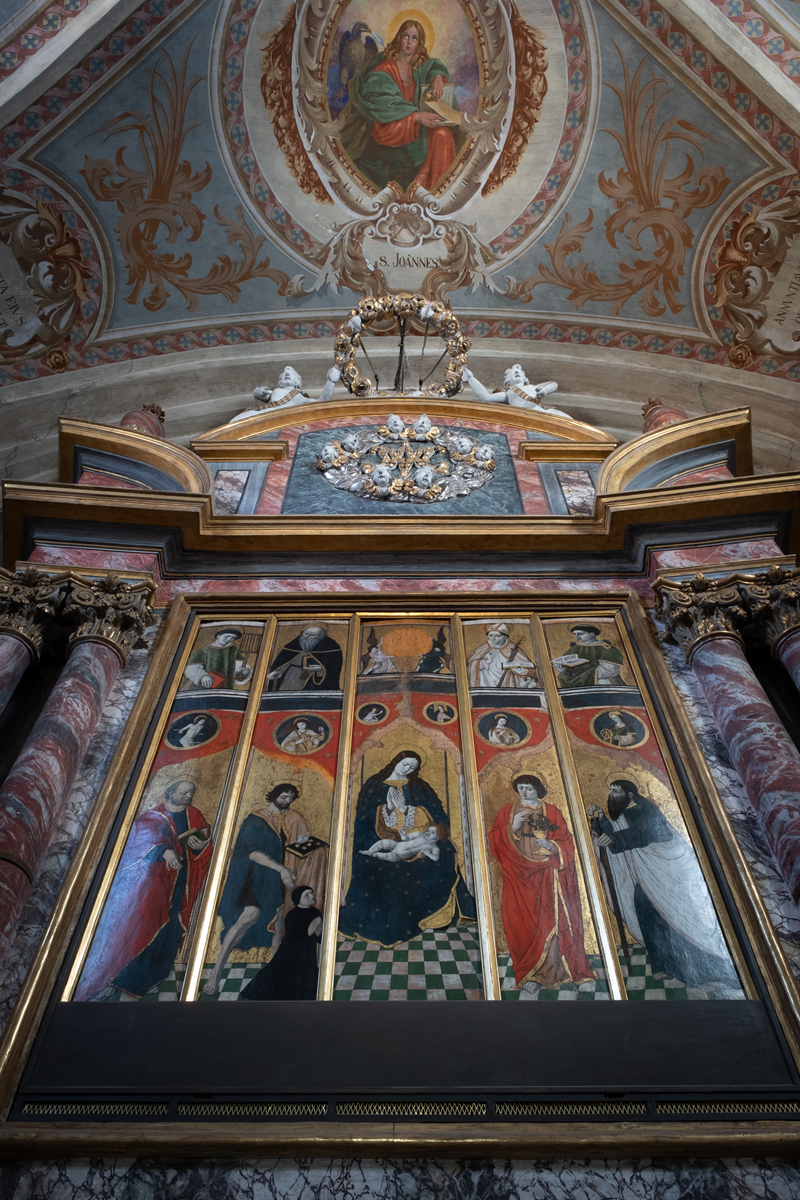 Retengut entre lhi mai importants de la pintura gòtica piemontèsa, es pintat a tempera d’uòu, sus dui registres. Sus la part sobeirana se tròbon de busts de Sants; sus aquela sotana lhi Sants a figura entièra, sot de pichòts tonds embè una mistaa.