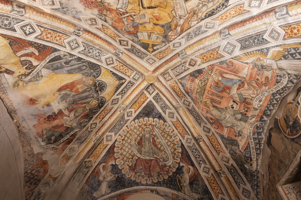 Diu es ariondat, dins la vòuta a crosièra, da Evangelistas e Doctors de la Glèisa. Sus las muralhas, bèla si esquasi despareissua, es l’istòria del martiri de Sant Manh, vestit da legionari.