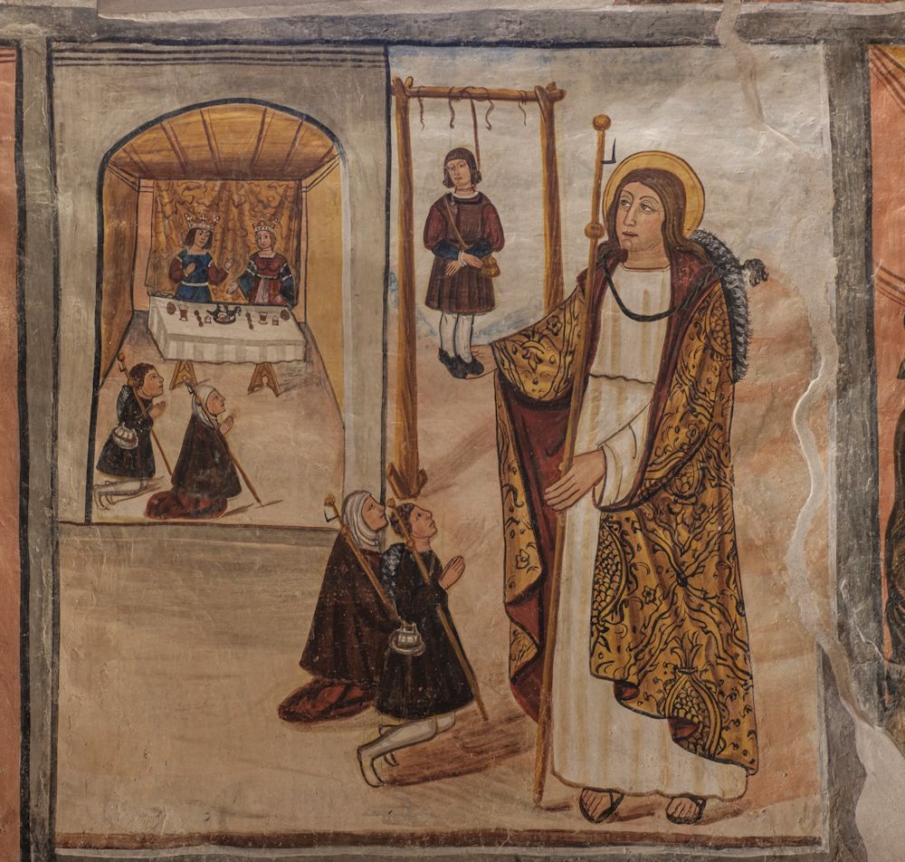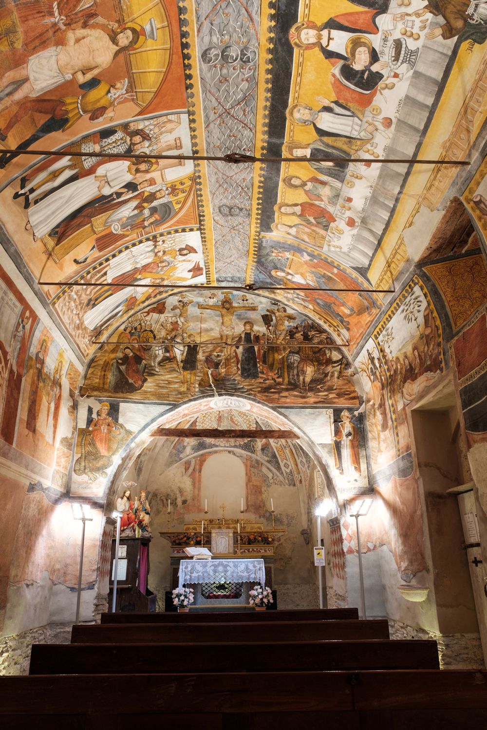 Las pinturas a fresc de la Chapèla Vielha son òbra del 1514 de Giovanni Botoneri de Querasc. Dapè de l’uis d’intrada Botoneri pinta l’originala gerarquia de Sants de la mitica Legion Tebea: Ponç, Constanç, Maurìtz, Manh, Chafrè, Dalmàs e Pancraci, premièrs evangelizators des valadas. A drecha de l’uis se tròbon lhi Sants Lucia, Apollonia, Marguerita e Martin de Tors.