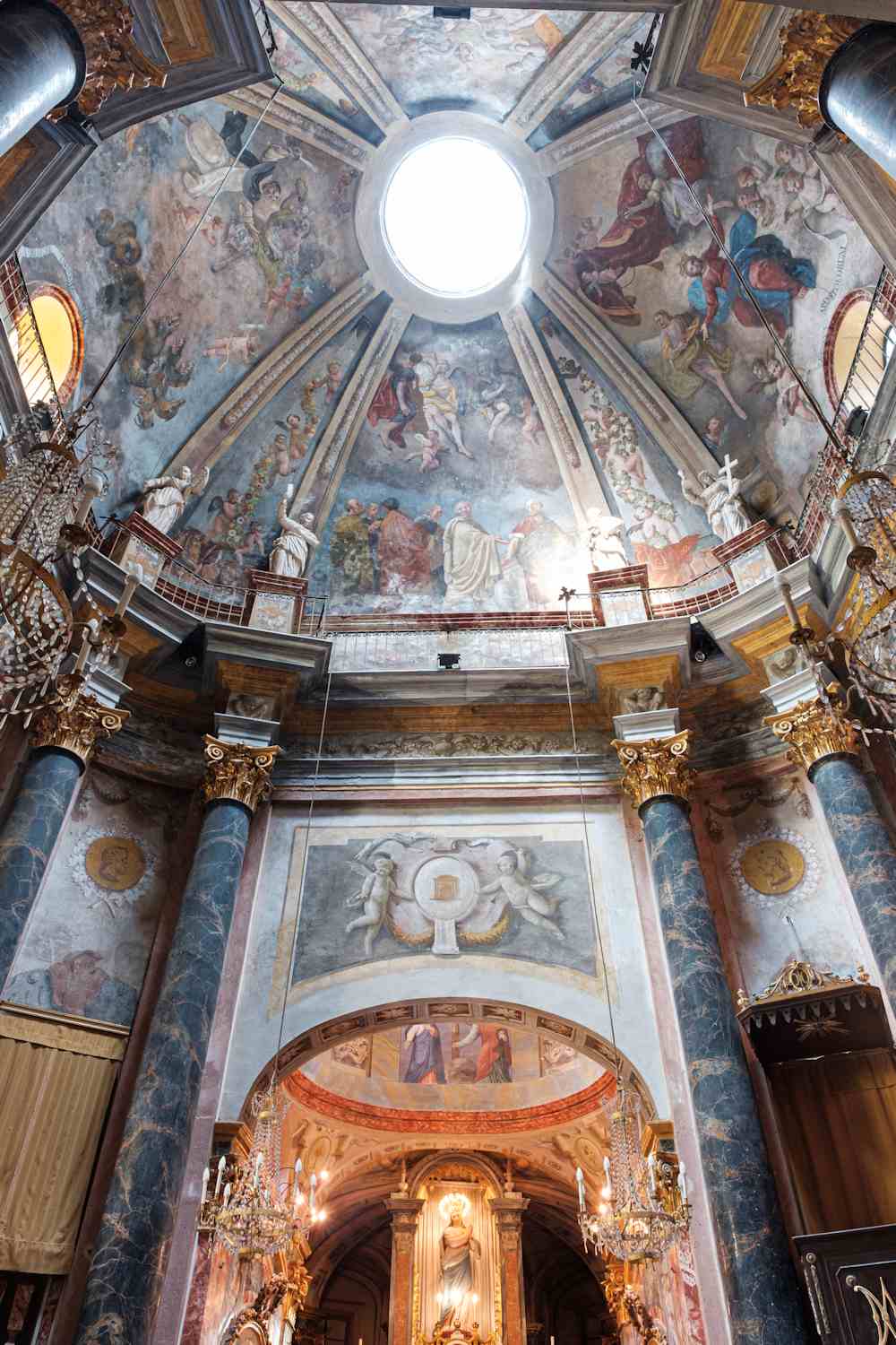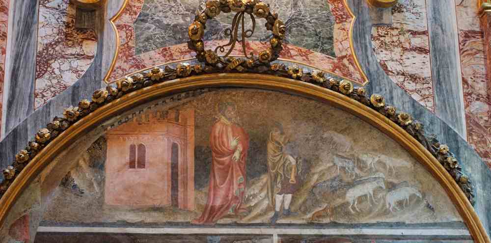 Lo Santuari decorat en marmos colorats a englobat en la chapèla de manchina l’antica estructura medievala, qu’a gardat un preciós cicle de frescs d’autor anònim, del 1410, abo las istòrias d’la Vita de Maria.