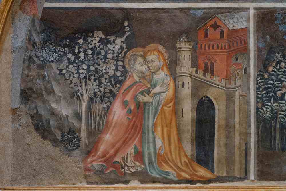 Las scenas son richas d’episòdis que venon da lhi Evangels Apòcrifs: Joaquin, vergonhós e malurós, escapa en campanha perquè la frema Ana pòl pas aver de mainaas; lo rescontre a la Pòrta Aurea, ente lhi dui s’embraçon e generon la Vierge; Sant’Ana qu’acocha la Vierge, abo l’ajut d’una levatrìs, moment da la dimension “familiara”, perquè a Sant’Ana pòrton del bròd de polastre.