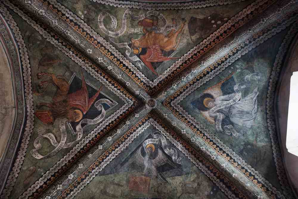 L’absida a drecha a gardat l’originaria vòuta a crotzièra frescaa abo lo Tetramòrf, lhi simbols di quatre evangelistas (Marc e lo leon, Matè e l’angel, Joan e l’aigulha e Luca abo lo tòr); l’òbra da la man decisa e lhi colors fòrts es estaa atribuïa a Hans Clemer, pintre de cort di Marqués de Saluces entre XV e XVI secle, conoissut coma Magistre d’Elva.