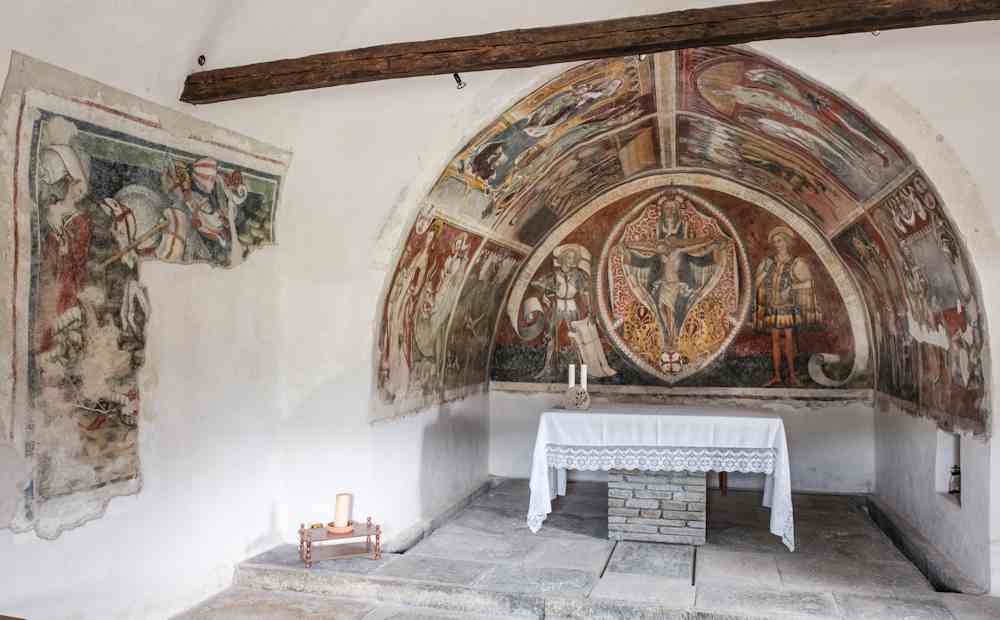Ental presbiteri, entre 1450 e 1460, Pèire da Saluces realiza sua comission del fraire del Marqués Ludovico II, Monsenhor Carlo Domenico Saluzzo, un original cicl de frescs en estil gòtic internacional lombard-piemontés. En l’absida dòmina la Trinitat entre lhi Sants Constanç e Bastian.
