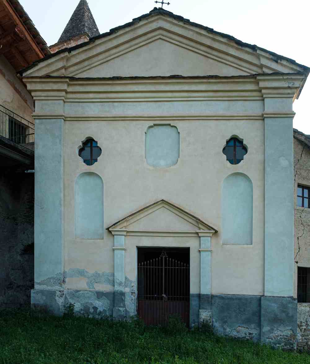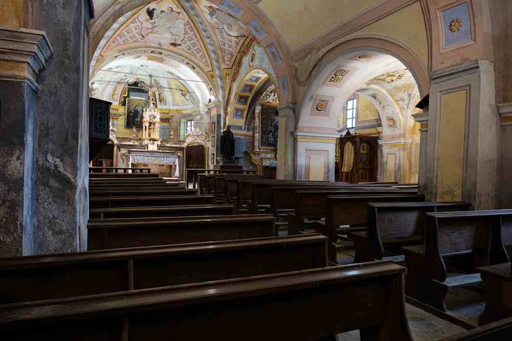 La primitiva glèisa ven bastia en estil romanic, coma es visibile dal cloquièr decorat da biforas, retruchat mai qu’un bòt; mas al temp de la Controreforma l’originala façada romanica laissa lo pòst a una en estil baròc. A la meitat de l’Uech Cents ven bastia la glèisa nòva, dediaa a Sant Joan Baptista e estachaa a la premièra, creant una sobrepausicion rara d’edificis e estils. Lo transet a tres vòutas a crosièra romanica embè costolons arionds en pèira esculturaa embè lo trigrama IHS (Jesùs) es la part mai vielha de la glèisa. Aprés ven jontaa la navada centrala embè vòuta a botala e, ental XVII sècle, la navada laterala. Lhi estucs e las pinturas baròcas an modifiat l’equilibri romanic.
